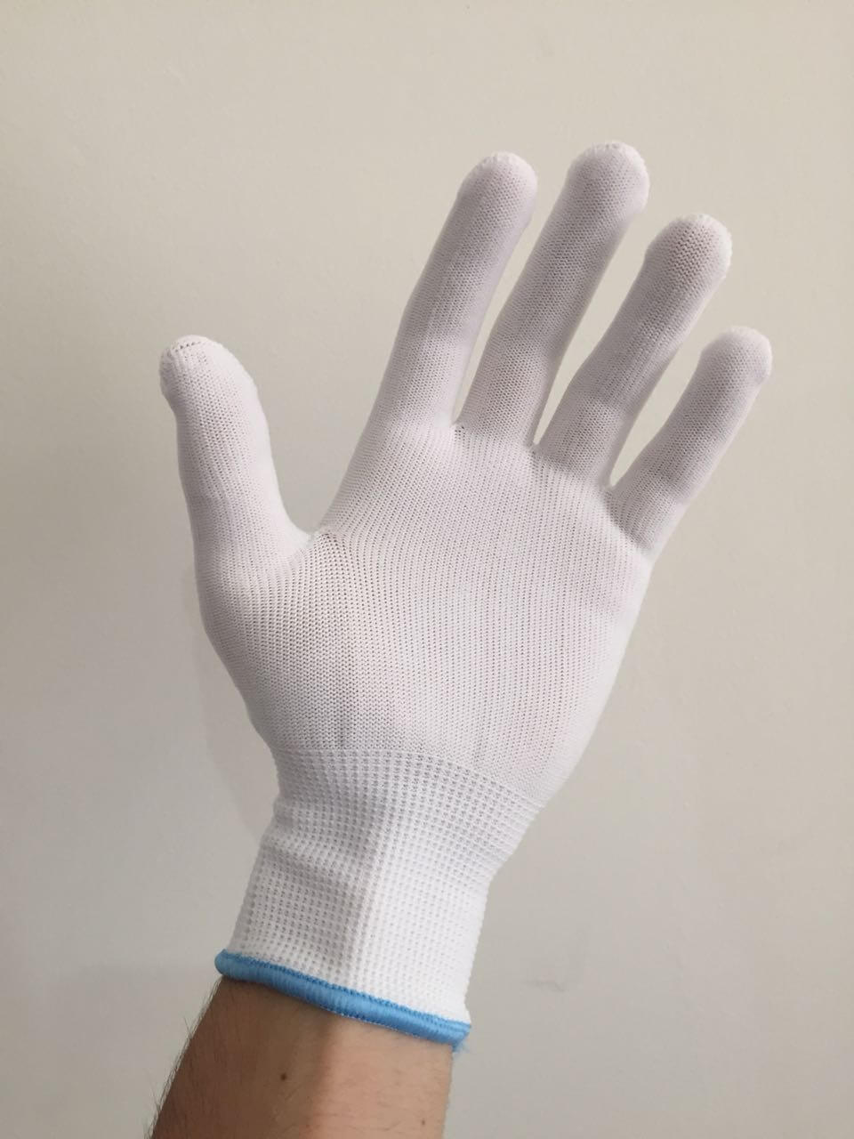 Guante de poliéster blanco. Ideal para uso en procesos donde se requiere una gran precisión y sensibilidad al tacto